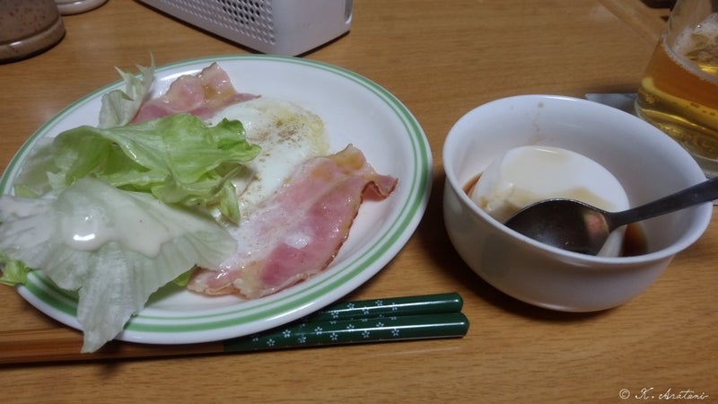 晩ごはんはベーコンエッグとジーマミ豆腐