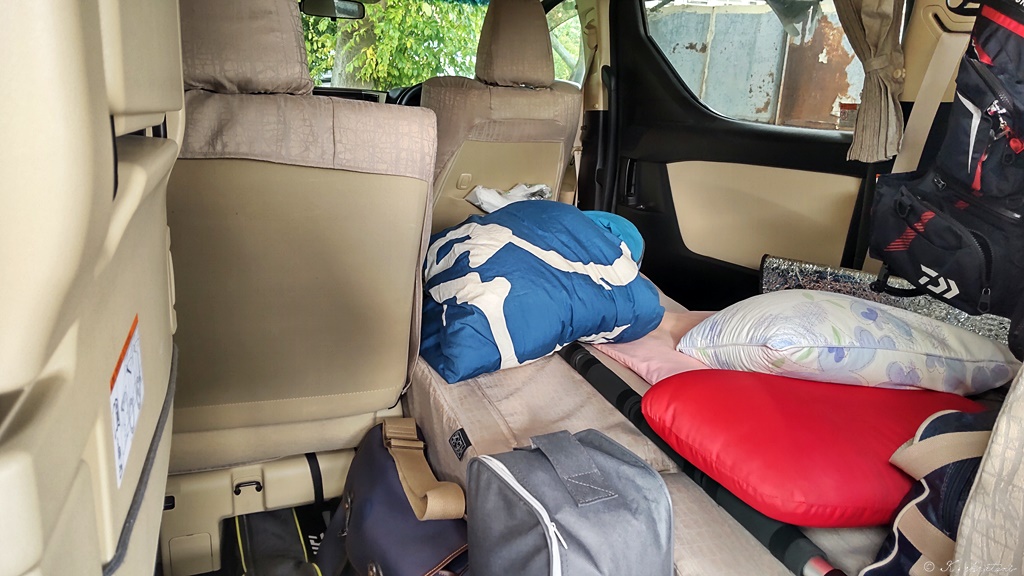 ちなみに他は,後部右側は就寝スペース。枕,恐竜シュラフとダウン布団つんでます。