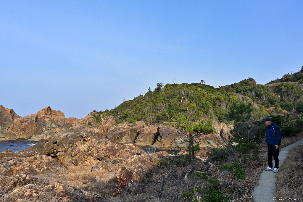 一路。唐音水仙公園へ。15時に駐車場着♪。少し回り道にはなりますが,林間の遊歩道を通って水仙の咲いている丘へ向かいました。もう最盛期をすぎたのかと思っていましたが,まだまだこれからだそうで,思ったほど水仙が咲いていません。でも,海と島とのコラボはいつも通り素敵な表情を見せてくれました。