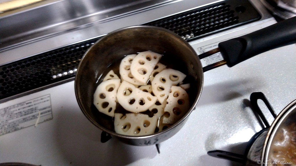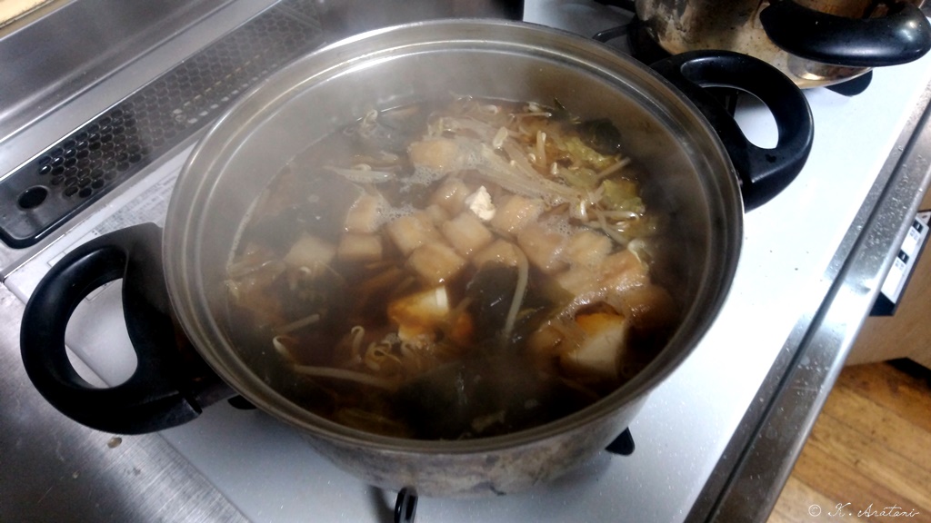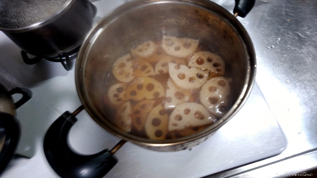 晩ごはん 白菜・豆腐・アブラゲ・麩・もやしの赤出汁味噌汁をつまみ食いしながら調理。朝,生みそインスタントしじみ(1人用)5パックが賞味期限切れだったので使用です。レンコンの煮物と酢レンコンも作り置きしました。〆は板わかめでご飯