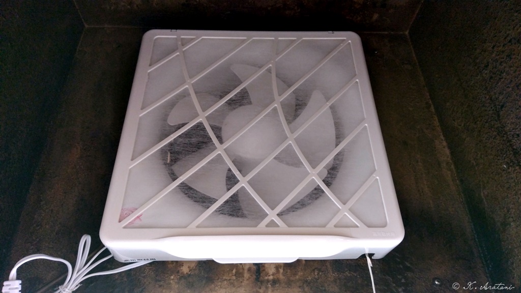 昼ごはんは玄米を紫蘇昆布で食べました。午後は,換気扇の取り換え。新築から35年。たぶん一回も替えたことのない換気扇です。少し前からシャッターが一枚取れてしまって,外が見える(笑)開口部断熱工事をするのですが,これでは全く意味がない。カネはないけど,ヒマはある。自分で交換することにしたのです。