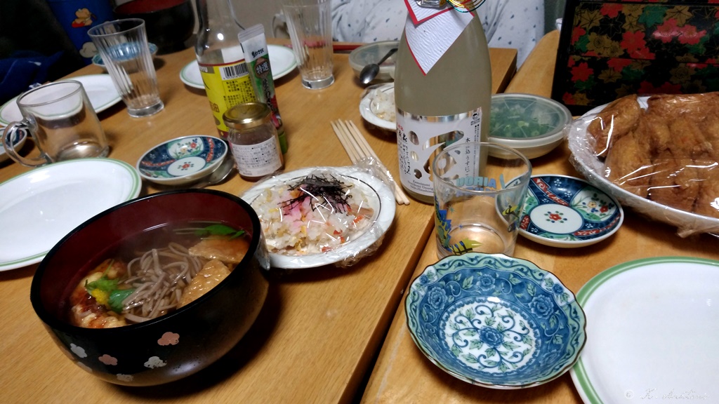 晩ごはん。年越しの天ぷらきつね蕎麦。稲荷寿司。おせち料理とらふぐ刺し刺身盛り合わせ日本酒は2本,栓を抜きました。