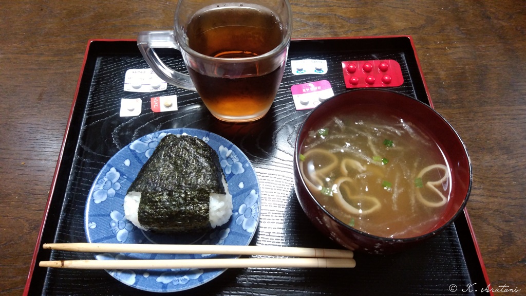 朝ごはんは昆布のお握りと生みそゆうげ@賞味期限切れ。