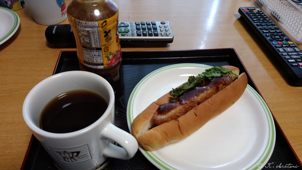 遅めのランチは,できあいのホットドッグ