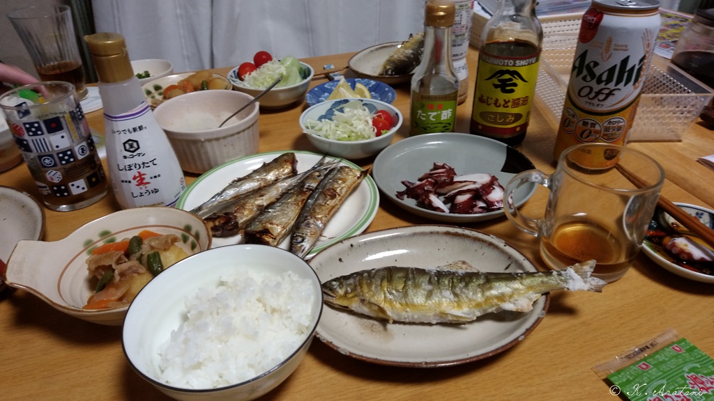晩ごはんは豪勢に鮎・さんま・肉じゃが・タコの刺身等