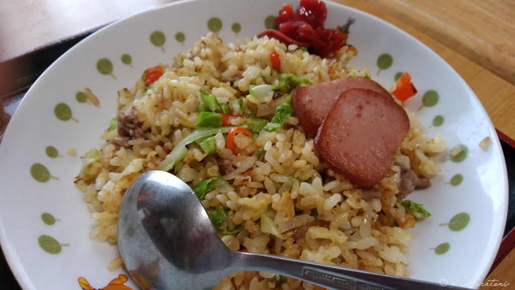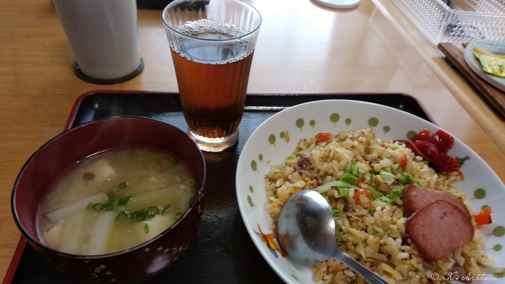 昼ごはん 正午少し前にチャーハンと味噌汁。豚肉・玉葱・赤ピーマン・キャベツを炒めて、味塩胡椒。夕べの残りご飯に生玉子を混ぜ込んでから投入。しばらくしてから、混ぜ合わせて更に炒めて出来上がり。夕べの鍋の残り使用の味噌汁。福神漬け。魚バーグと一緒に食べました。