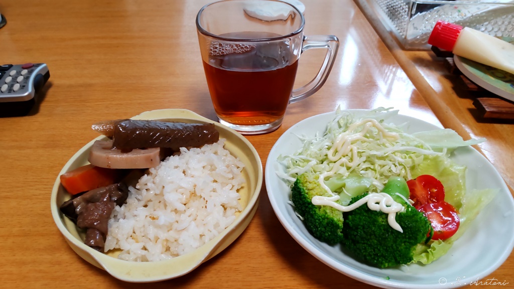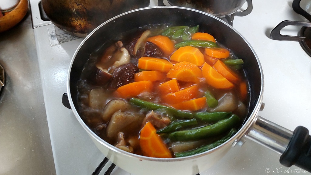 昼ごはんの前に煮物を追加制作。昼ごはんは野菜サラダ・煮物。