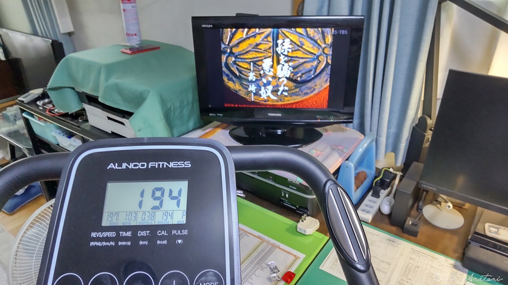 食後に水戸黄門見ながらエアロバイク。水戸黄門は18部デジタルリマスター版。西村晃黄門さまです。200kcal 30分
