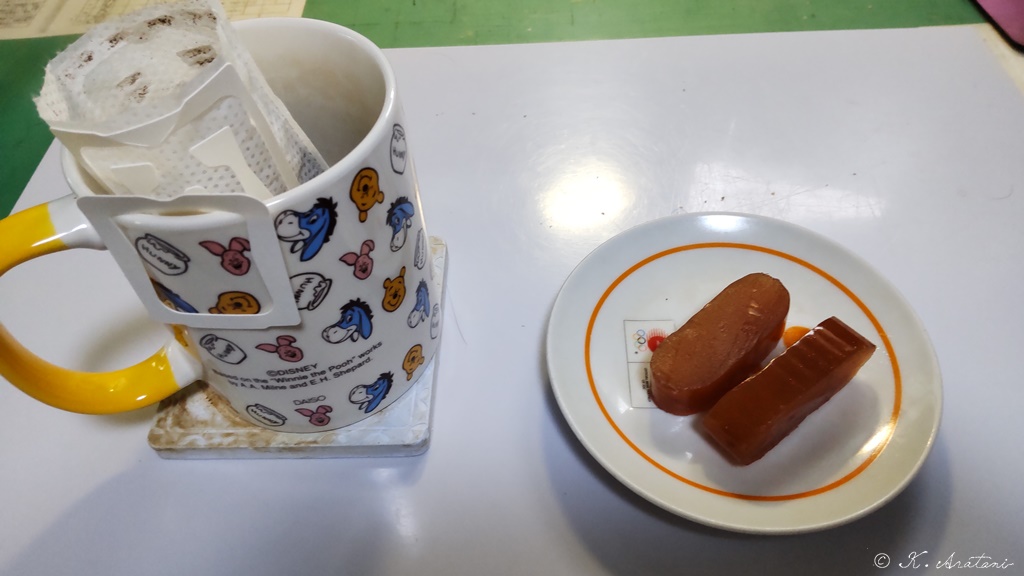 おやつは安芸太田町の祇園防柿使用に羊羹とコーヒー
