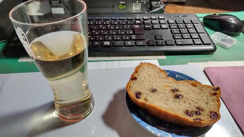 おつまみは失敗したレーズンパン。へちゃげてるけど,中はふわふわで美味しい。