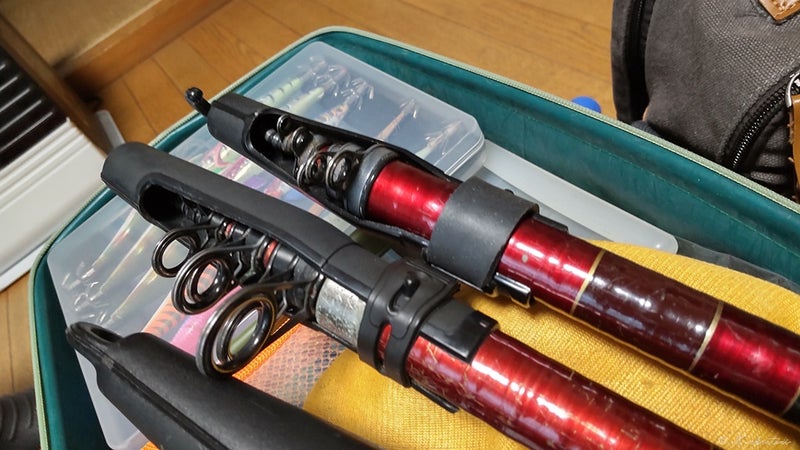 トップカバーのゴムが朽ちて切れてたので,ホームセンターでゴムチューブバンドを買ってきて補修。埃をかぶっていた竿ケースも洗いました。この竿ケース,1990年の五島列島で撮ってもらった写真にも写っているので,もう30年選手です。