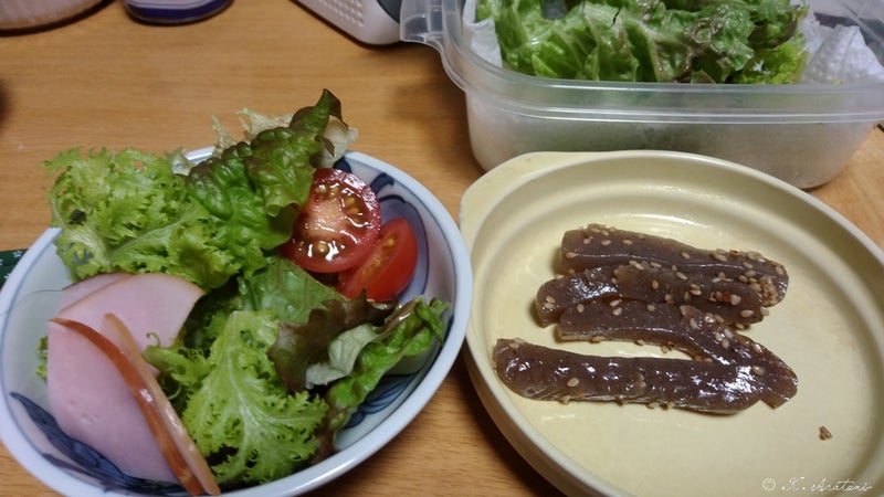 晩ごはん 炒めこんにゃくとサラダでお湯割りを一杯
