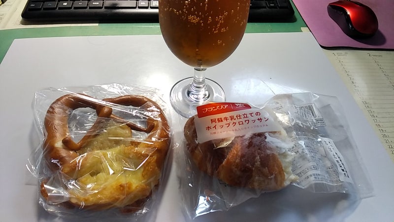 朝ごはん チーズプレッエルだけでやめておけばいいものを、ホイップクリームたっぷりのクロワッサン。合わせると確実に500kcal超えそう。