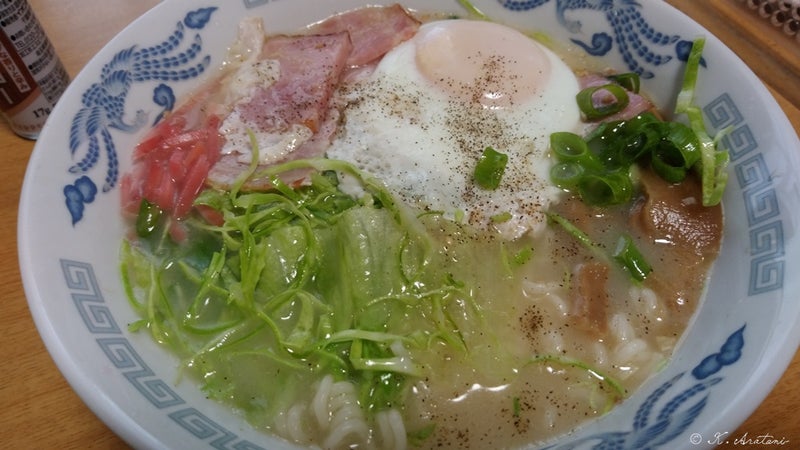 朝食はうまかっちゃんにベーコンエッグ♪