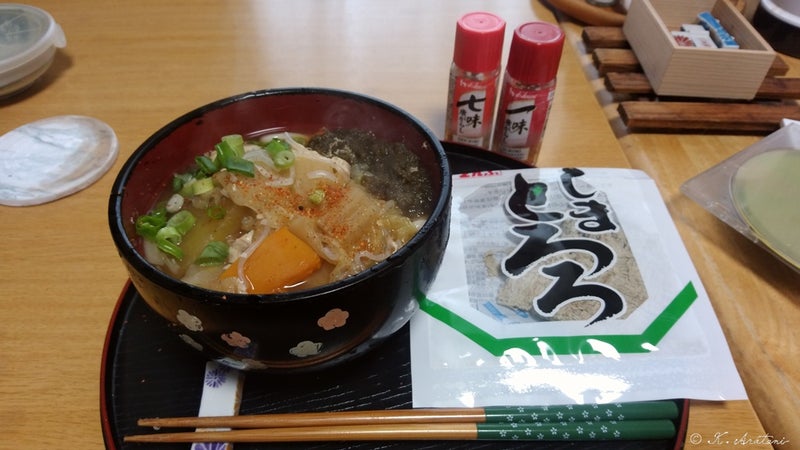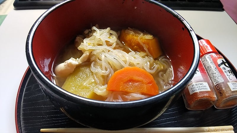 朝ごはんは昨日の汁に糸こんにゃく入れて食べました。