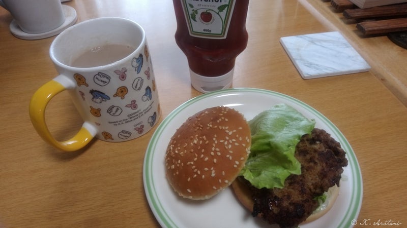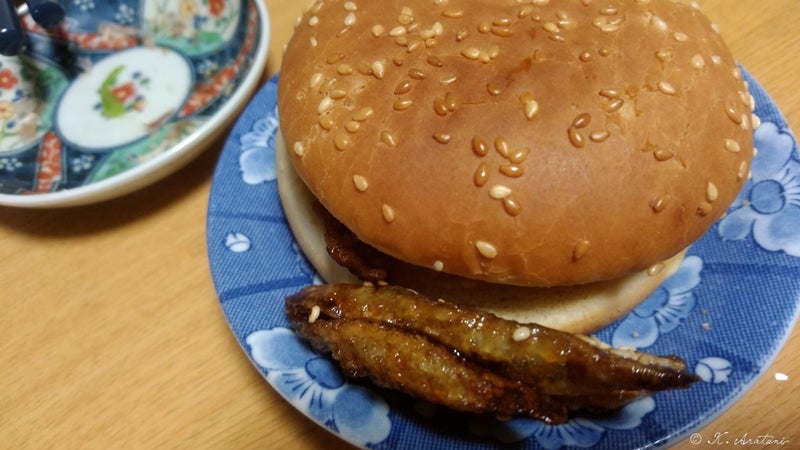ごはんが残り少なくて1膳しかなかったので、なんちゃってハンバーガーで水割り呑んでます。