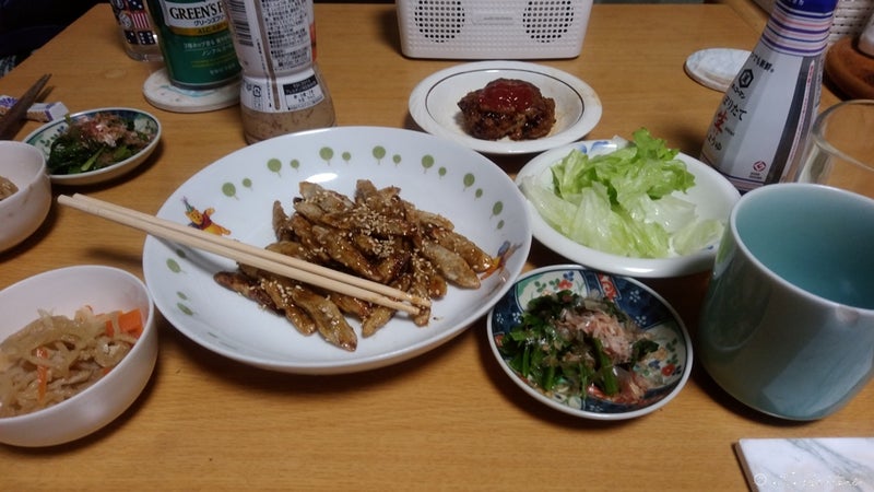 晩ごはんは、ごぼう天などで焼酎お湯割りを二杯